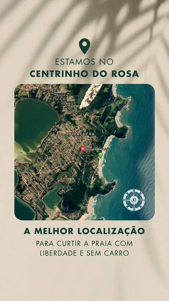Bem centrinho da Praia do Rosa, onde se encontra as lojinhas e os melhores restaurantes da região. Além disso, perto dos bares com música ao vivo e todo o comércio em geral. A distância até a praia é de 800 metros, em torno de 10 minutos de caminhada.